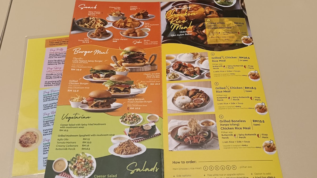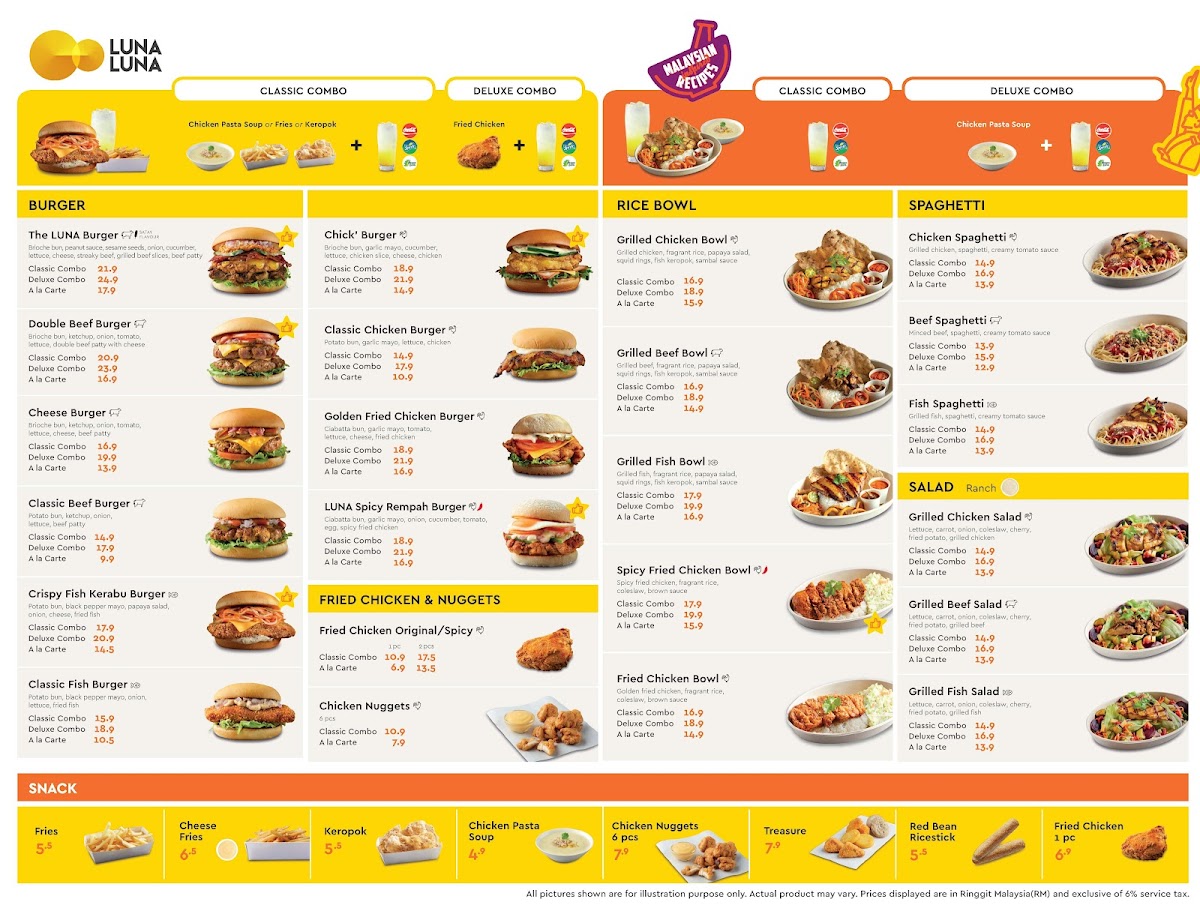 Luna Luna - Setia City Mall offers a refreshing twist on classic Malaysian favorites with a focus on bold flavors and unique combinations. Their signature Grilled Chicken Burger Combo features tender grilled chicken, melted cheese, fresh lettuce, cucumber, and garlic aioli, served alongside crisp shoestring fries and a refreshing iced lemon tea—a perfect balance of savory and zesty. For those craving richer flavors, the Luna Burger with Peanut Sauce Combo surprises with double smashed patties, beef streaky, and a luscious satay peanut sauce that delivers a nostalgic local kick.